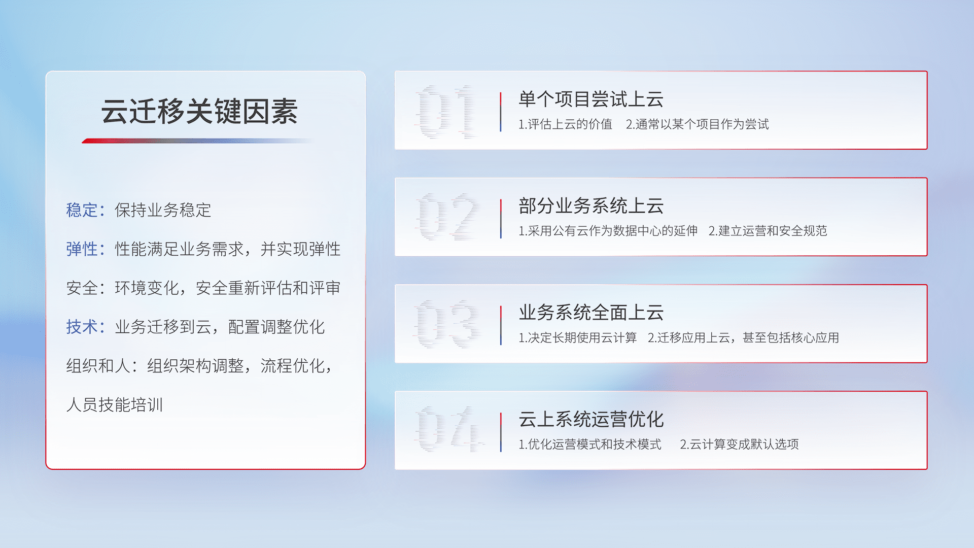结合实际业务,,,从规划设计、、云平台选型、、云原生改造、、数据迁移、、、集成交付,,,,迁移全过程为客户识别最佳上云路径,,,,做好风险识别管理,,,,设计网络架构、、、身份权限、、、、安全审计合规、、、操作审计、、、、日志审计、、、监控告警策略、、、多站点容灾设计等,,对云上基础设施进行整体规划,,,,提升IT治理水平,,,,以满足弹性、、、高可用、、高性能的需求。。