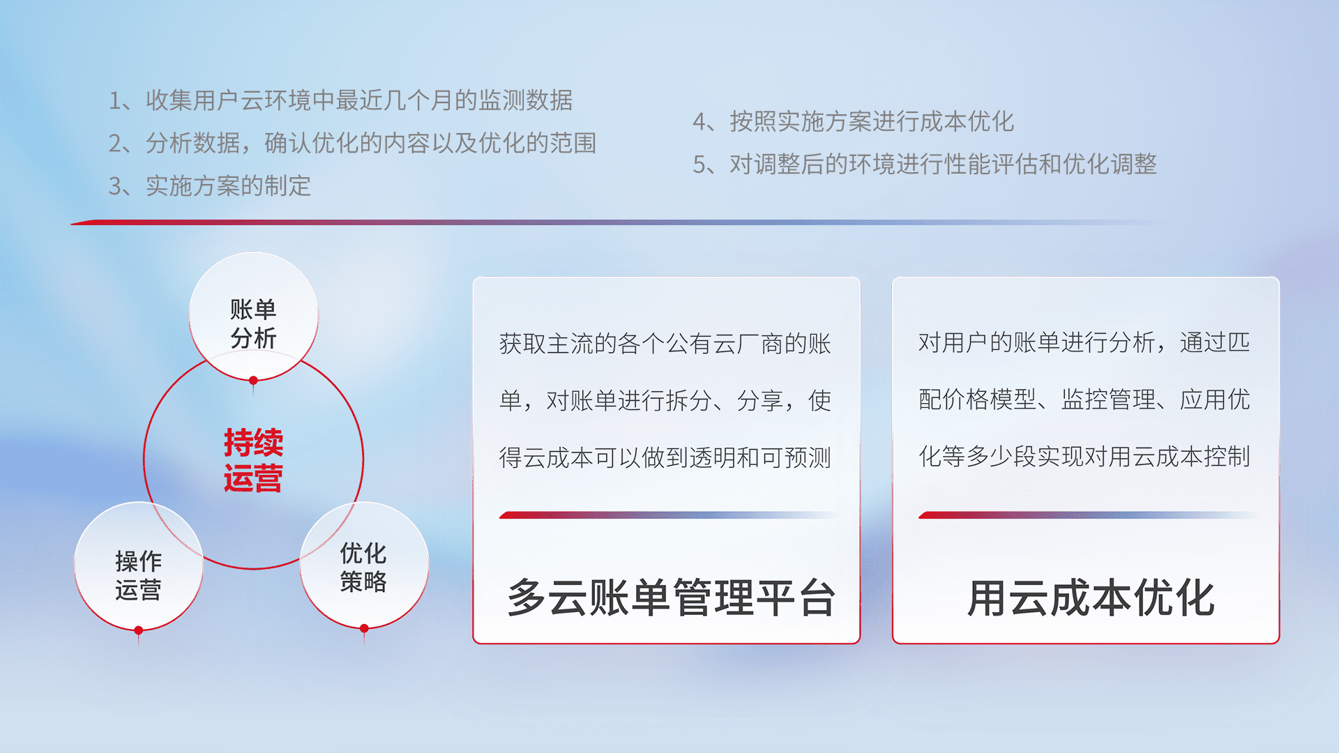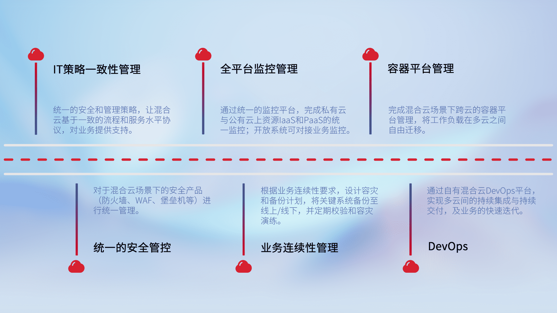 通过多云纳管,,以统一的资源数据模型把客户的云资源进行抽象和封装,,,,进而实现对多云资源的统一操作,,,保障云资源管理的可靠性、、、稳定性与可用性。。。。量身定制化运维内容,,,配置、、、、开发运维、、、、补丁管理、、、备份、、、监控、、认证和访问管理、、、、审计和日常巡检等,,,保障在用云过程中的可靠度,,,,稳定度以及高可用率。。。。