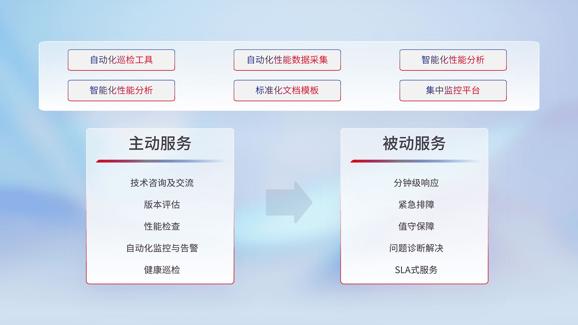 智能化工具和标准化文档,,,保障服务质量,,,提供主动服务(包含技术咨询、、、版本评估、、、性能检查、、、、自动化监控与告警、、健康巡检)和被动服务包含(分钟级响应、、紧急排障、、值守保障、、、、问题诊断解决、、、、SLA服务)。。。